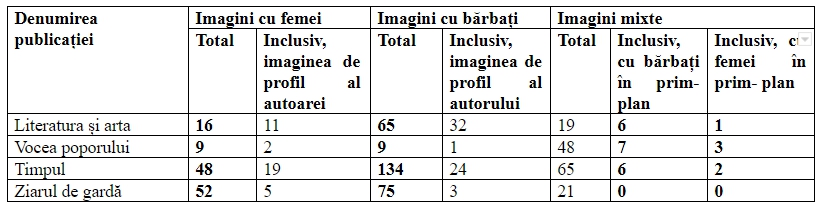 Săptămânalul „Literatura și arta” plasează la fiecare articol și poza de profil a autorului. Din analiza efectuată deducem că autorii bărbați sunt de trei ori mai prezenți pe paginile ziarului decât autoarele femei.
