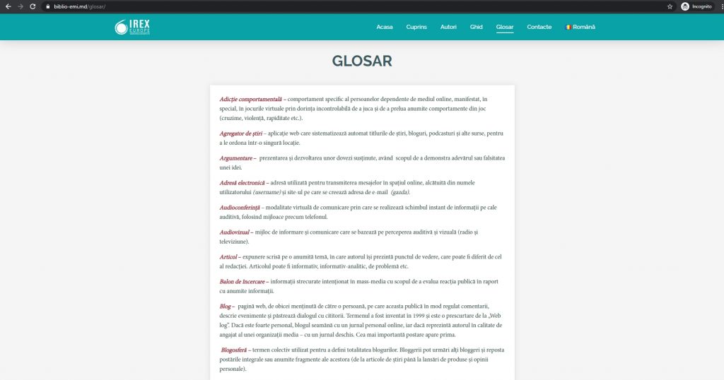 Manualul oferă un Glosar, care poate fi accesat de pe bara orizontală. Acesta include 112 definiții ale termenilor și conceptelor-cheie din manualul Educație mediatică și cultură informațională.