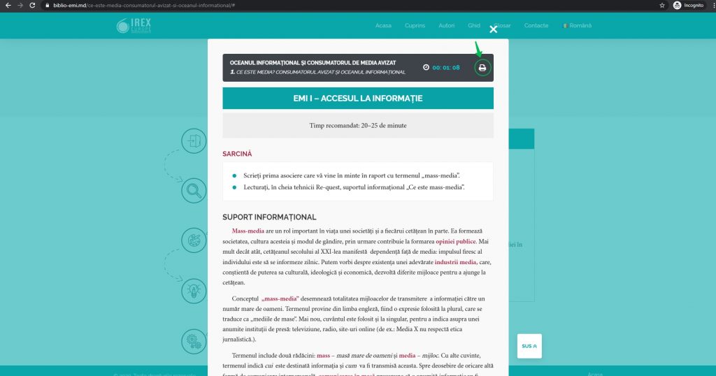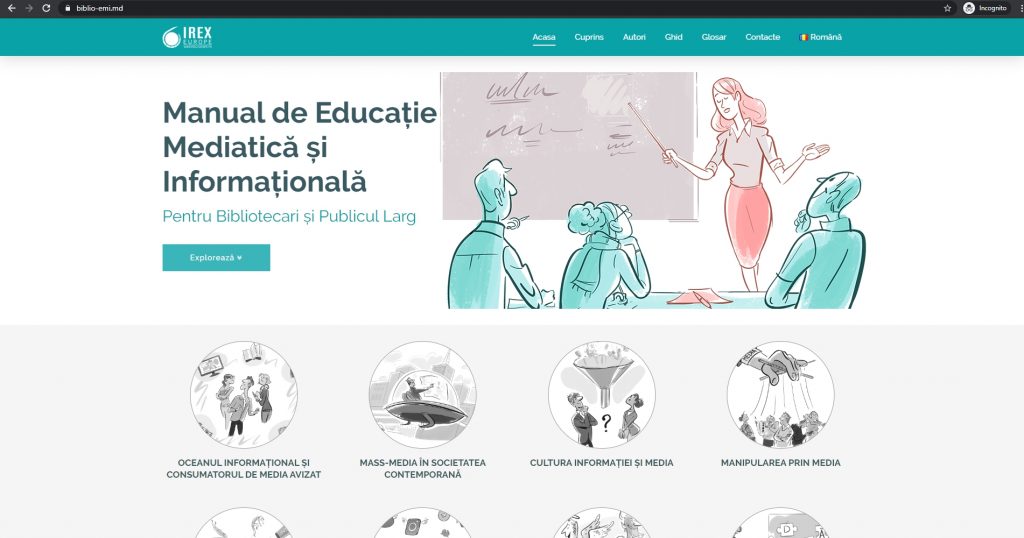 Dragi utilizatori, manualul de Educație mediatică și cultură informațională a fost realizat în baza curriculumului omonim (link spre curriculum vă rog) și este destinat bibliotecarilor formatori, precum și oricărui bibliotecar sau trainer care intenționează să utilizeze manualul digital în activități cu beneficiarii. Manualul poate fi accesat, în mod gratuit și liber, pe adresa https://abrm.purple.md/biblioemi/