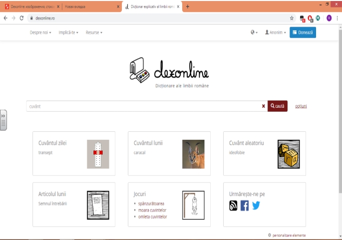 - Examinați casetele Curiozități, Cuvântul zilei, Cuvântul lunii, Cuvânt aleatoriu, Articolul lunii și Jocuri.