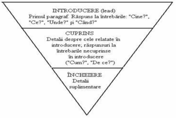 Structura piramidei inversate plasează cele mai importante aspecte ale unei știri la început. Esențial pentru această structură este introul de tip cine?, când?, unde? și cum?. Cu cât detaliile sunt mai puțin importante pentru articol, cu atât mai târziu acestea apar în articol.