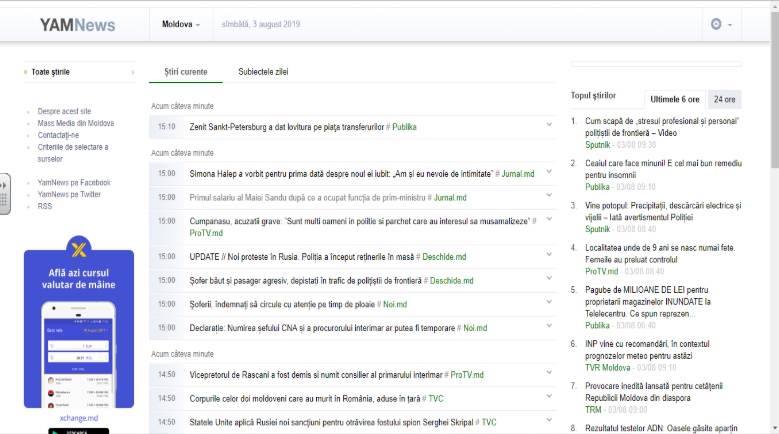 - Accesați agregatorul de știri News.yam.md (https://news.yam.md/). Acesta include cele mai recente știri din Republica Moldova și funcționează în regim automatizat, în timp real, 7 zile pe săptămână, 24 de ore pe zi, prelucrând/catalogând automat informația.